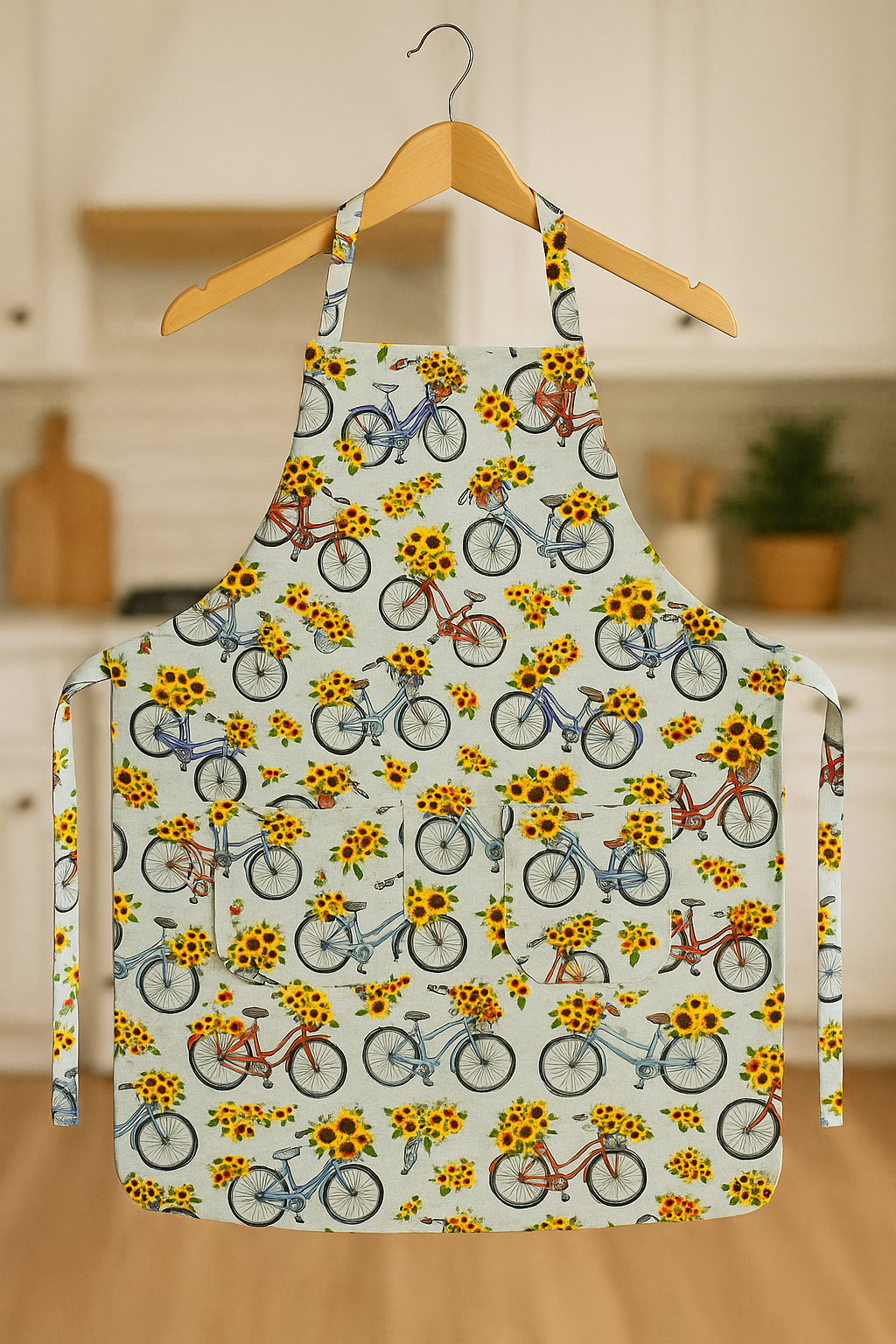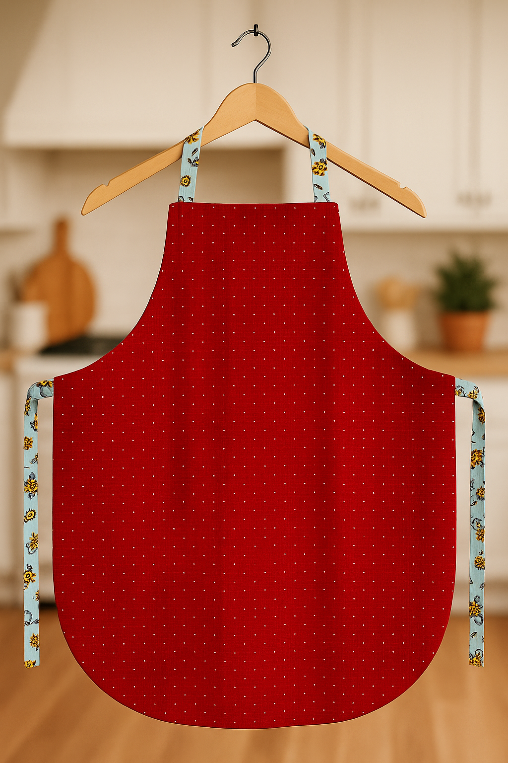Bring charm, cheer, and farmhouse warmth into your kitchen with this handmade reversible apron, featuring a beautiful bicycle-and-sunflower print on one side and a stunning deep red dotted fabric on the other. Whether you’re cooking, gardening, crafting, or gifting, this apron blends style, durability, and functionality in every stitch.