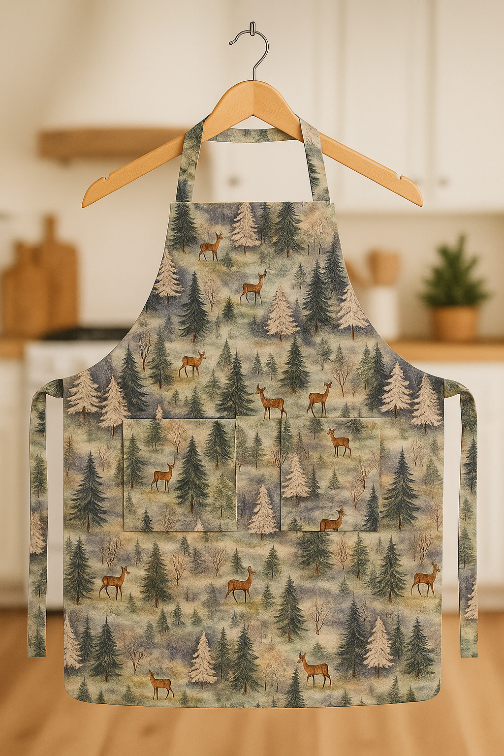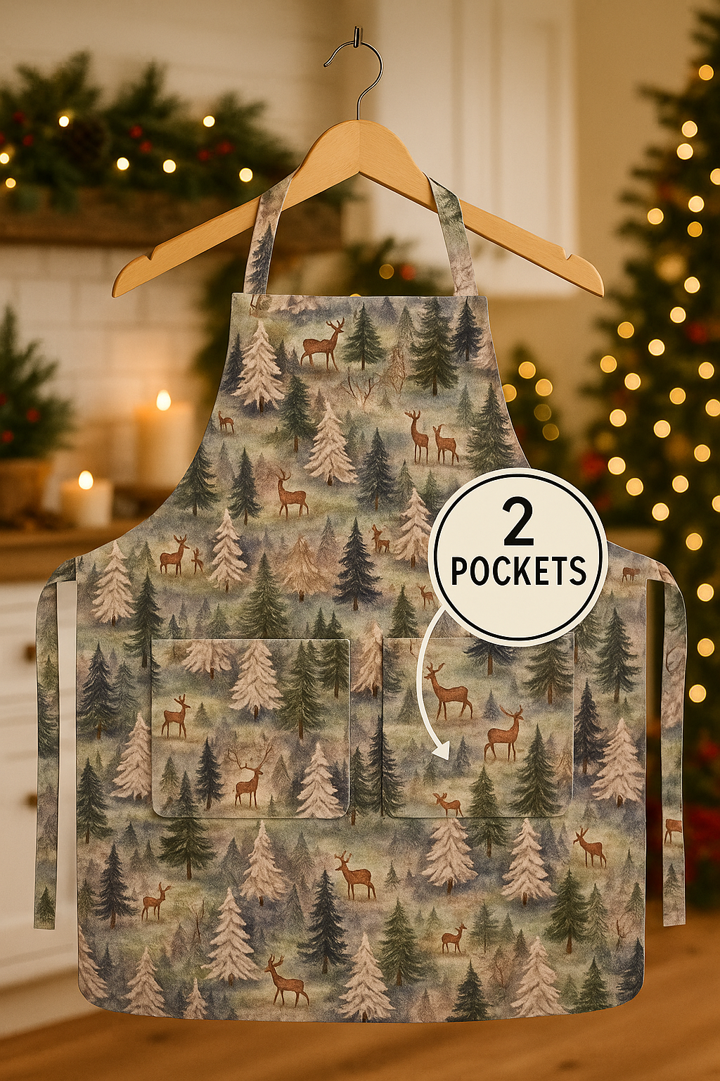 This apron isn’t just functional—it’s décor-worthy. Its calming palette of forest greens, earthy browns, and snowy whites captures the peaceful charm of winter mornings. Whether you’re preparing Christmas dinner or gifting a loved one, this apron adds warmth and style to every moment.